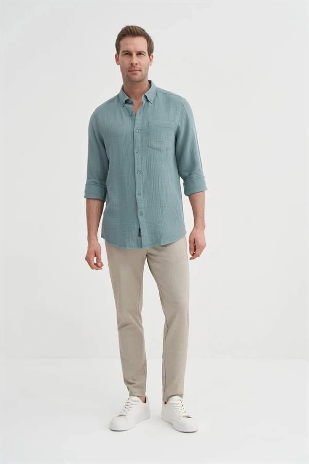2024 Uzun Kollu Müslin Kumaş Erkek Gömlek Haki