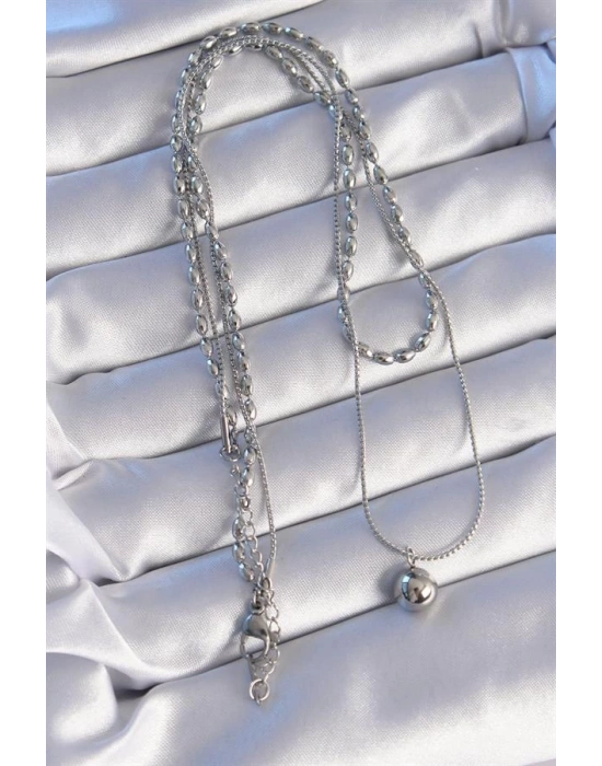 316L Çelik Çift Zincirli Gümüş Renk Topçuk Model Kolye