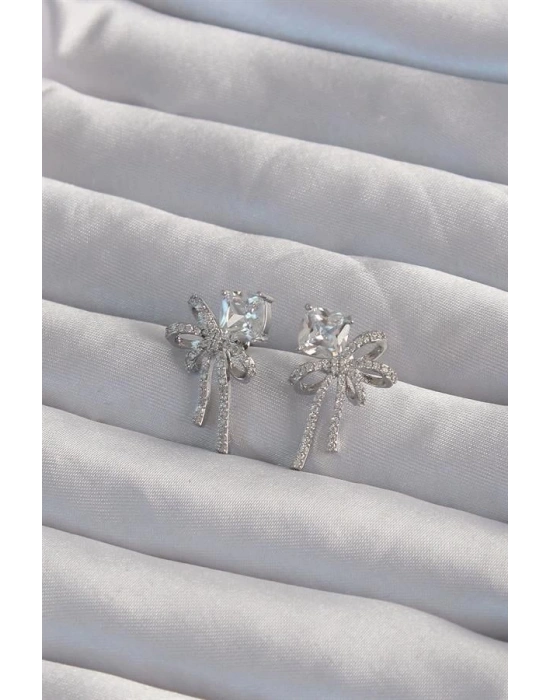 Pirinç Gümüş Renk Kare Zirkon Taşlı Fiyonk Küpe