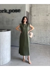 Madonna yaka midi yırtmaçlı kuşaklı keten elbise